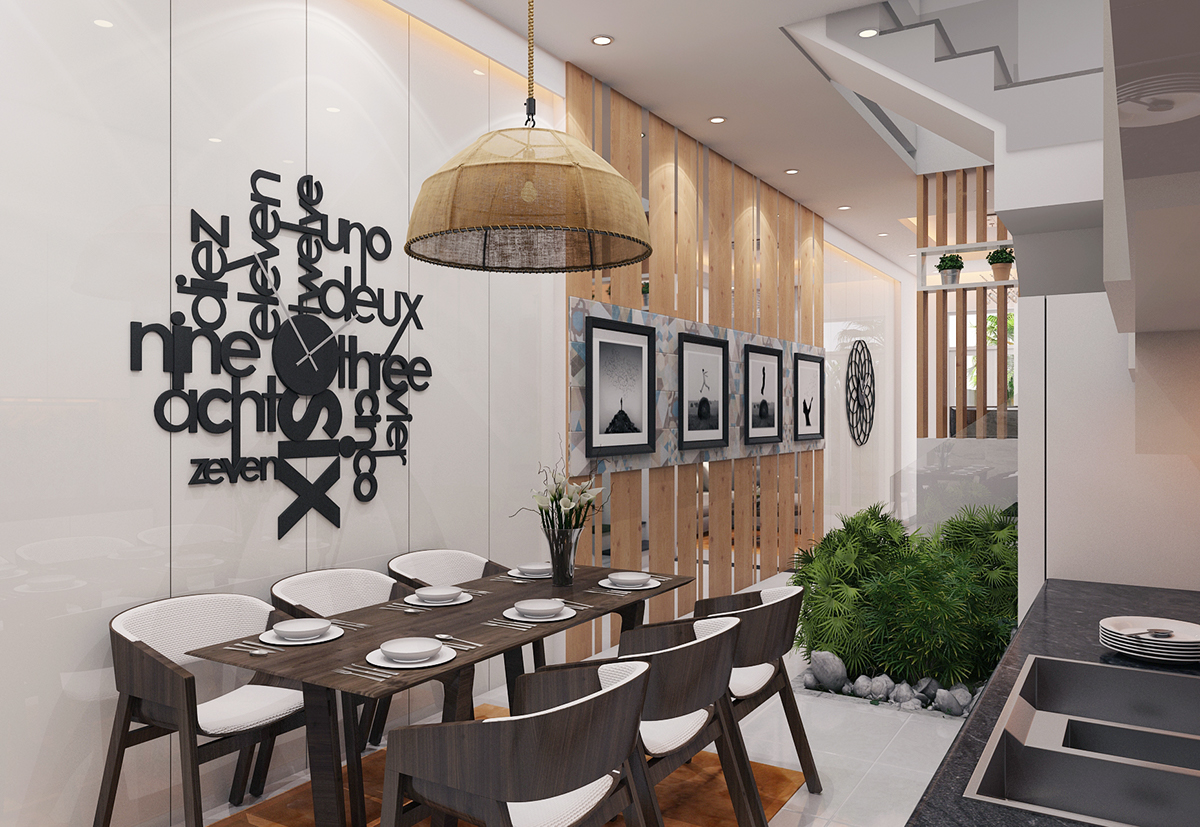 Các mảng tường chạy dài và hẹp là điểm yếu trong trang trí các ngôi nhà hẹp chiều ngang nay trở thành điểm nhấn sinh động và phân không gian cho tầng trệt công trình.