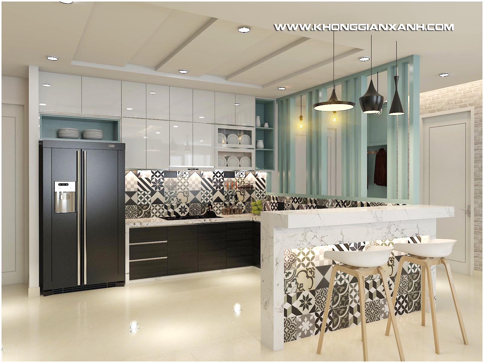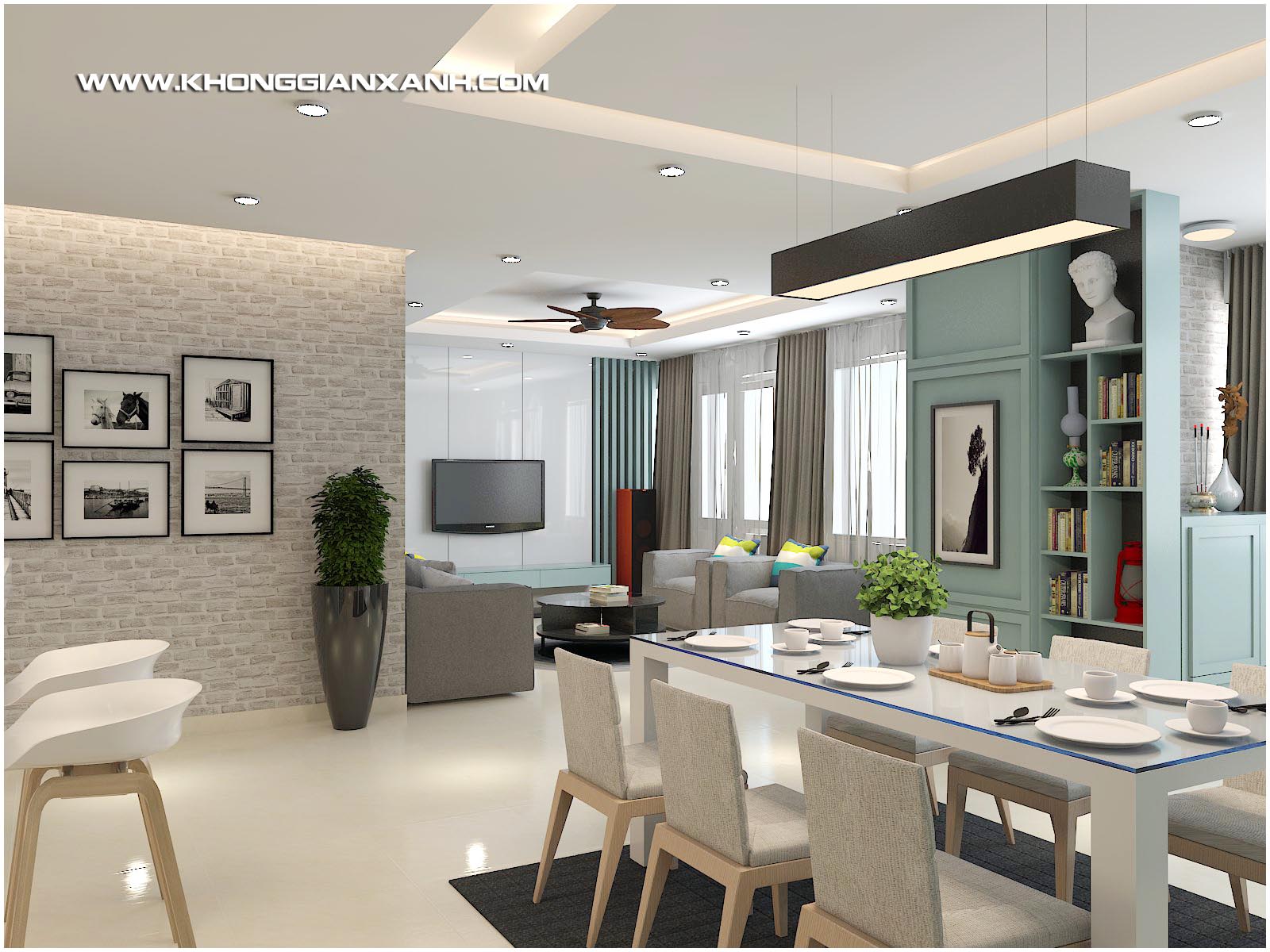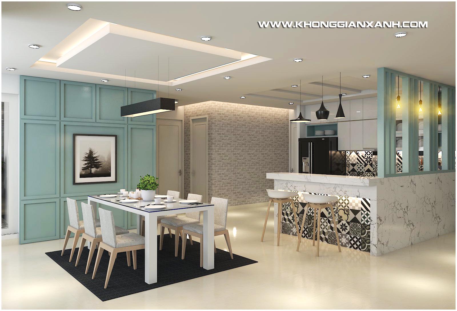 Phong cách thiết kế: Không gian mở hiện đại, với ton màu xanh ngọc chủ đạo, kết hợp các mảng phối gạch gợi nét cổ điển.