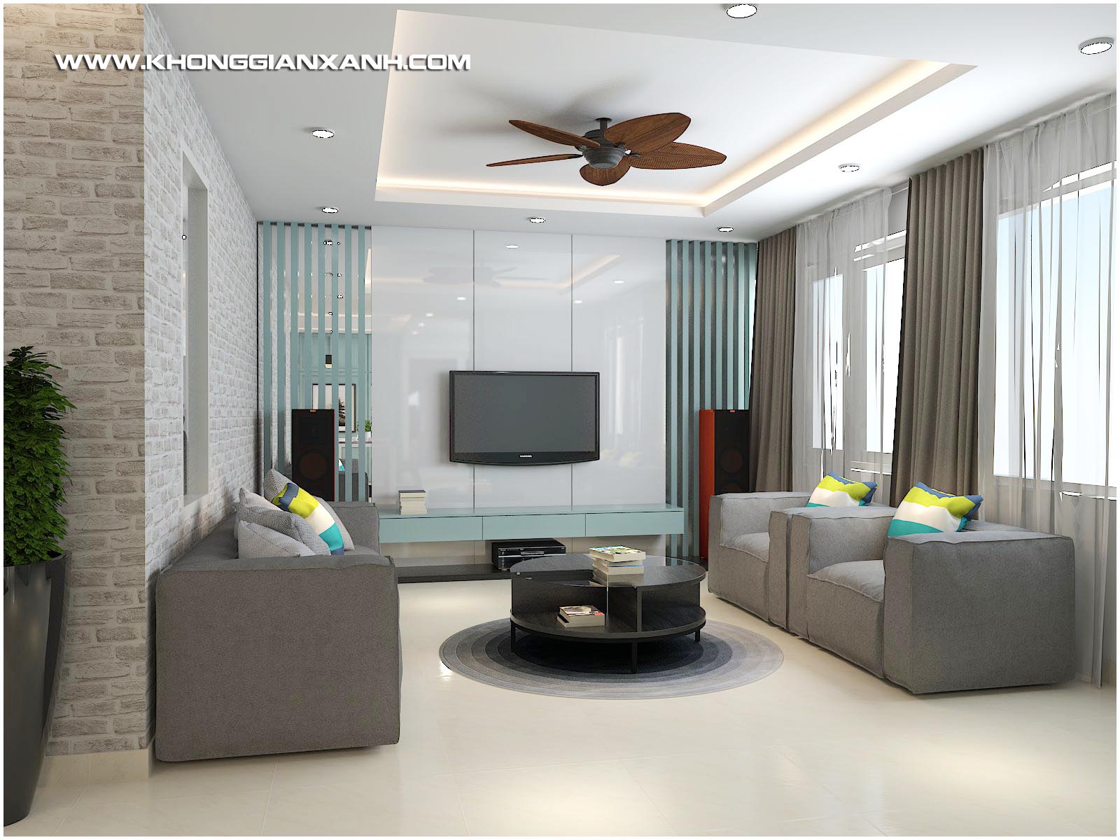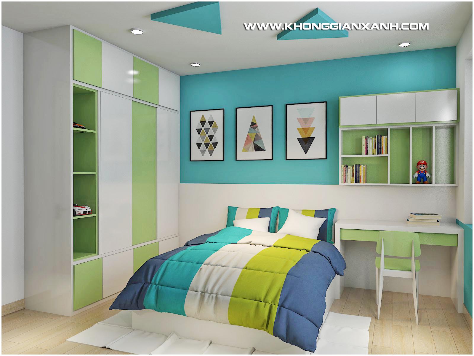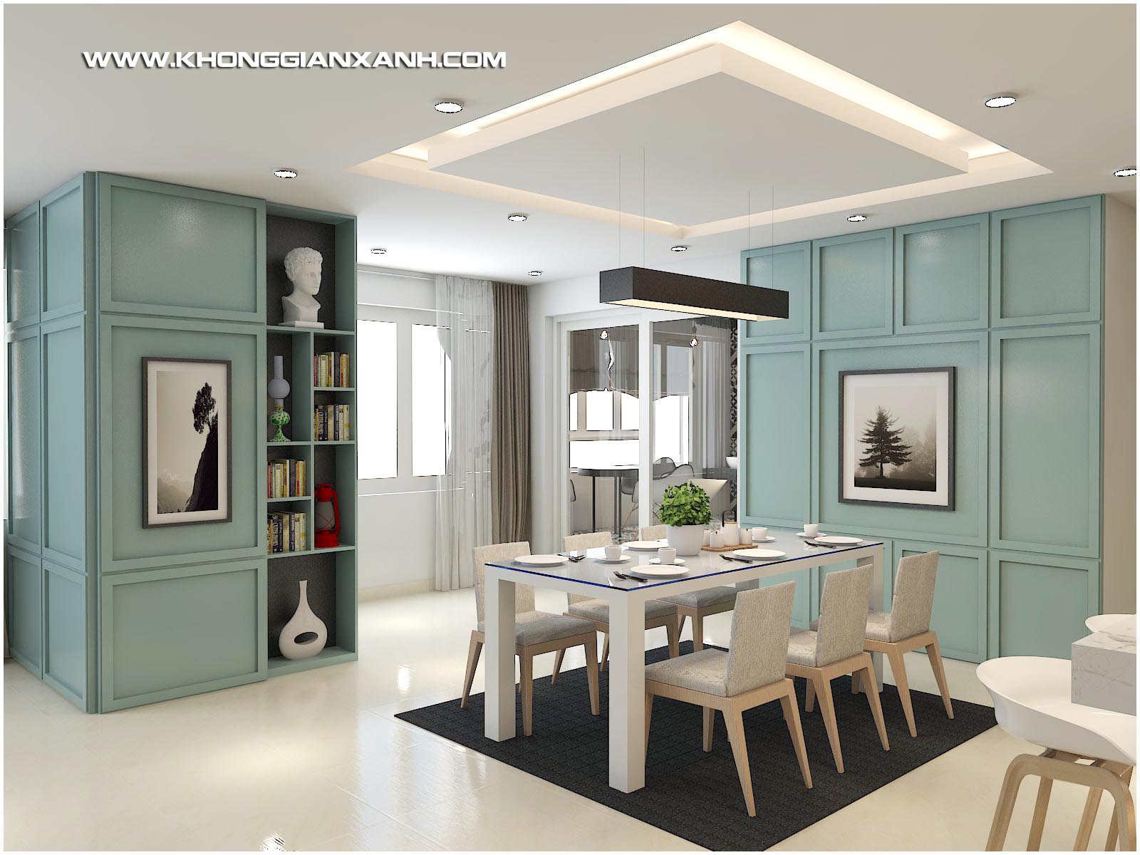 Phong cách thiết kế: Không gian mở hiện đại, với ton màu xanh ngọc chủ đạo, kết hợp các mảng phối gạch gợi nét cổ điển.