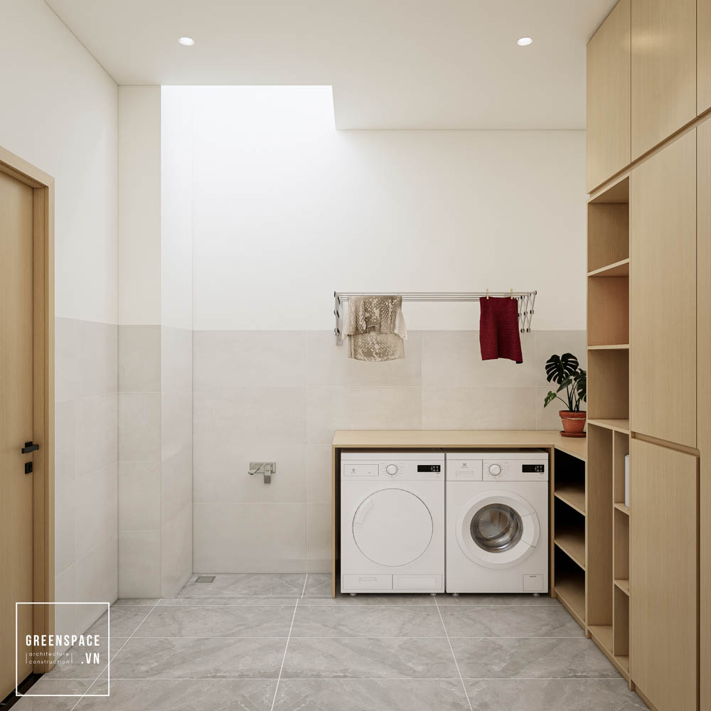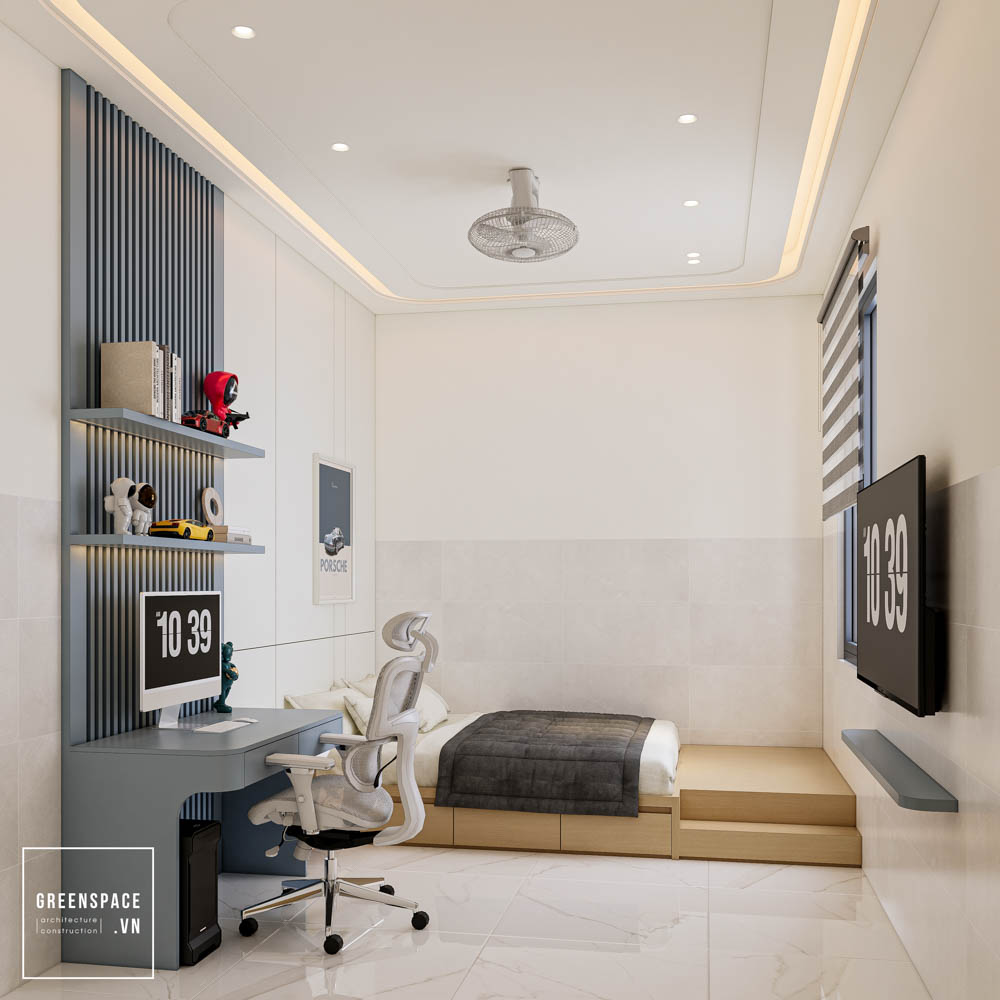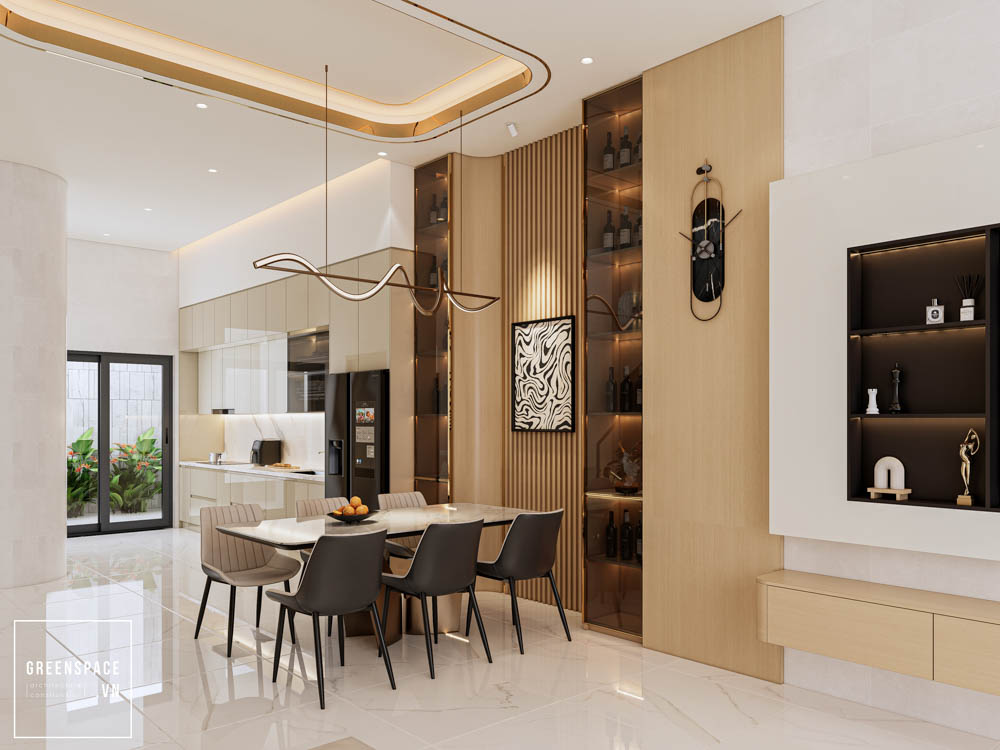Không gian nội thất nhà phố thiết kế hiện đại với gam màu trung tính tạo cảm giác nhẹ nhàng và sang trọng. Phòng khách liên thông bếp giúp tối ưu diện tích và tăng sự kết nối sinh hoạt gia đình. Hệ trần giật cấp kết hợp đèn led hắt mang lại chiều sâu và điểm nhấn thẩm mỹ tinh tế. Nội thất gỗ công nghiệp phối đá sáng màu tạo sự cân bằng giữa ấm cúng và hiện đại. Các phòng ngủ bố trí gọn gàng chú trọng công năng và sự thoải mái khi sử dụng. Khu vệ sinh thiết kế tối giản sử dụng vật liệu sáng màu tạo cảm giác sạch sẽ và thông thoáng.