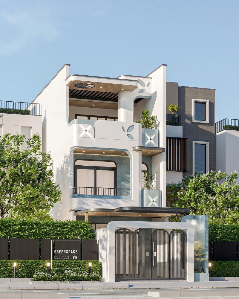 Mặt tiền nhà phố mang phong cách hiện đại với hình khối bo cong mềm mại tạo cảm giác nhẹ nhàng và khác biệt. Gam màu trắng chủ đạo kết hợp vật liệu ốp gỗ và kim loại giúp tổng thể vừa sang trọng vừa ấm áp. Ban công và logia được bố trí xen kẽ mảng xanh tạo sự thông thoáng và cân bằng vi khí hậu. Hệ lam và chi tiết trang trí hình lá giúp mặt đứng sinh động và tăng tính nhận diện kiến trúc. Tầng trệt sử dụng cửa kim loại kết hợp kính đảm bảo an ninh và vẫn giữ được sự thoáng sáng.