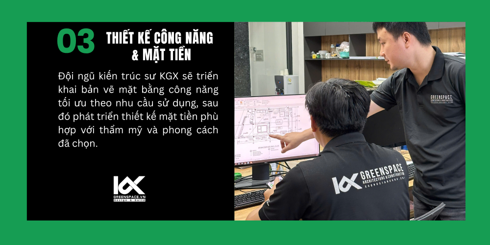 Dựa trên nhu cầu sử dụng và hiện trạng khu đất, kiến trúc sư triển khai phương án bố trí công năng chi tiết và thiết kế mặt tiền phù hợp phong cách đã chọn, đảm bảo thẩm mỹ và công năng sử dụng tối ưu.