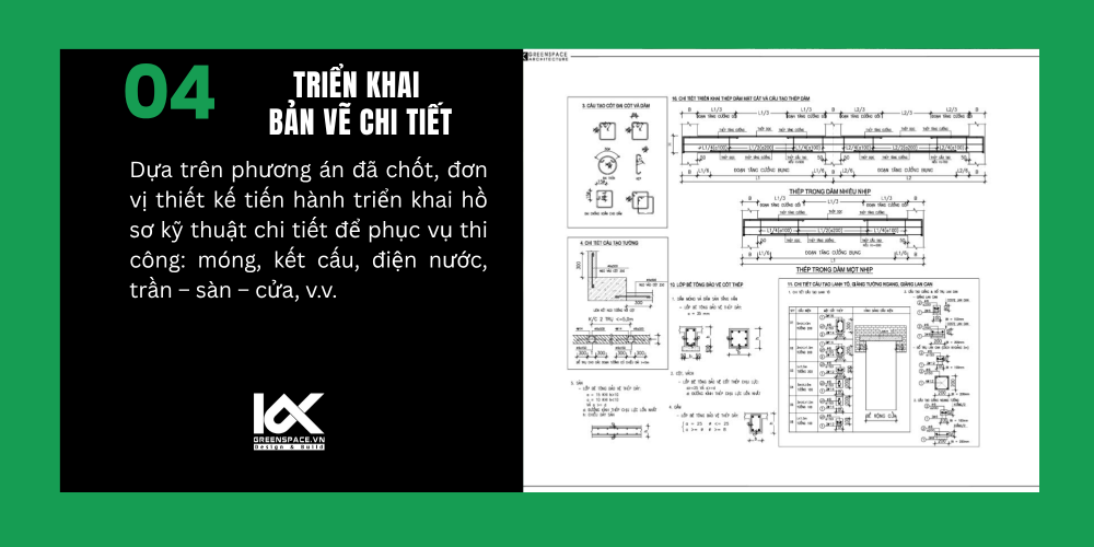 Từ phương án đã thống nhất, đội ngũ thiết kế tiến hành triển khai hồ sơ kỹ thuật thi công bao gồm kiến trúc, kết cấu, điện nước, giúp quá trình thi công diễn ra chính xác và hạn chế phát sinh.
