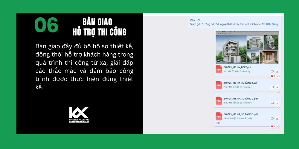 Sau khi hoàn tất thiết kế, toàn bộ hồ sơ được bàn giao đầy đủ cho khách hàng. Trong quá trình thi công, đơn vị thiết kế vẫn hỗ trợ kỹ thuật từ xa để đảm bảo công trình được xây dựng đúng theo bản vẽ.