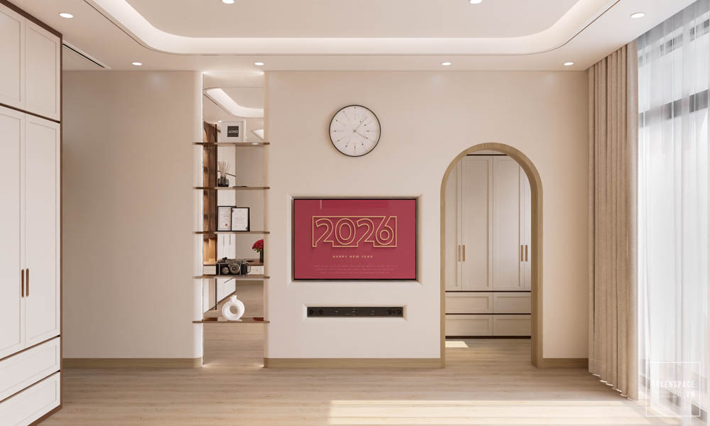 Nội thất V’House mang phong cách hiện đại, gam màu be sáng, tạo cảm giác ấm áp và tinh tế. Không gian mở liên thông phòng khách, bếp và cầu thang giúp ngôi nhà rộng rãi hơn. Hệ tủ âm tường và kệ trang trí bo cong tăng tính gọn gàng, sang trọng. Ánh sáng tự nhiên kết hợp đèn hắt trần làm nổi bật vật liệu và chi tiết nội thất. Sofa dáng thấp, bàn trà tròn và thảm trung tính tạo điểm nhấn nhẹ nhàng. Thiết kế cầu thang kính và lan can mảnh giúp tổng thể thanh thoát, hiện đại.