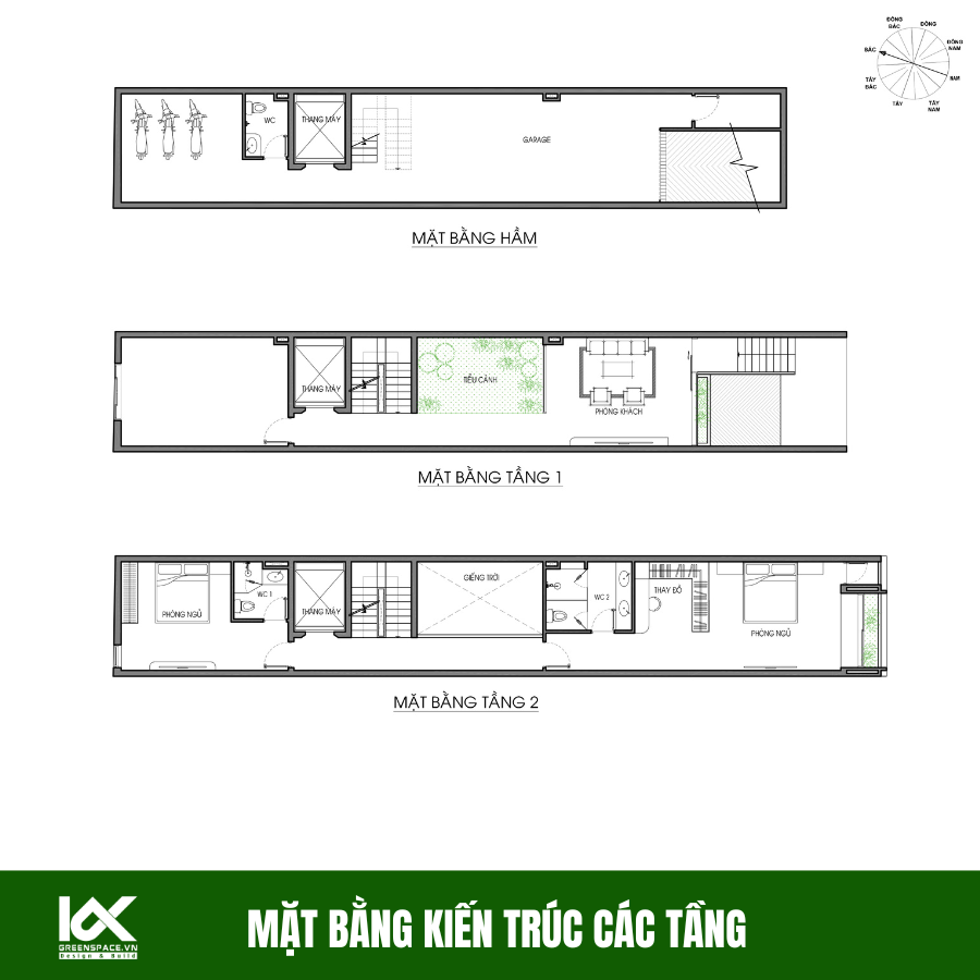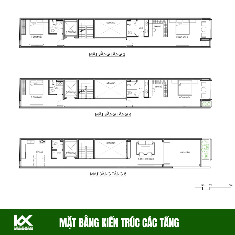 Mặt bằng hầm bố trí gara xe rộng rãi, kết nối thang bộ và thang máy thuận tiện. Tầng một tổ chức phòng khách liên thông tiểu cảnh, tăng thông thoáng và lấy sáng tự nhiên. Tầng hai đến tầng bốn bố trí phòng ngủ riêng tư, kết hợp giếng trời và khu vệ sinh khép kín. Giao thông đứng đặt giữa nhà giúp phân luồng sử dụng rõ ràng và tối ưu diện tích. Tầng năm bố trí bếp ăn, sinh hoạt chung và sân thượng xanh, tạo không gian thư giãn.