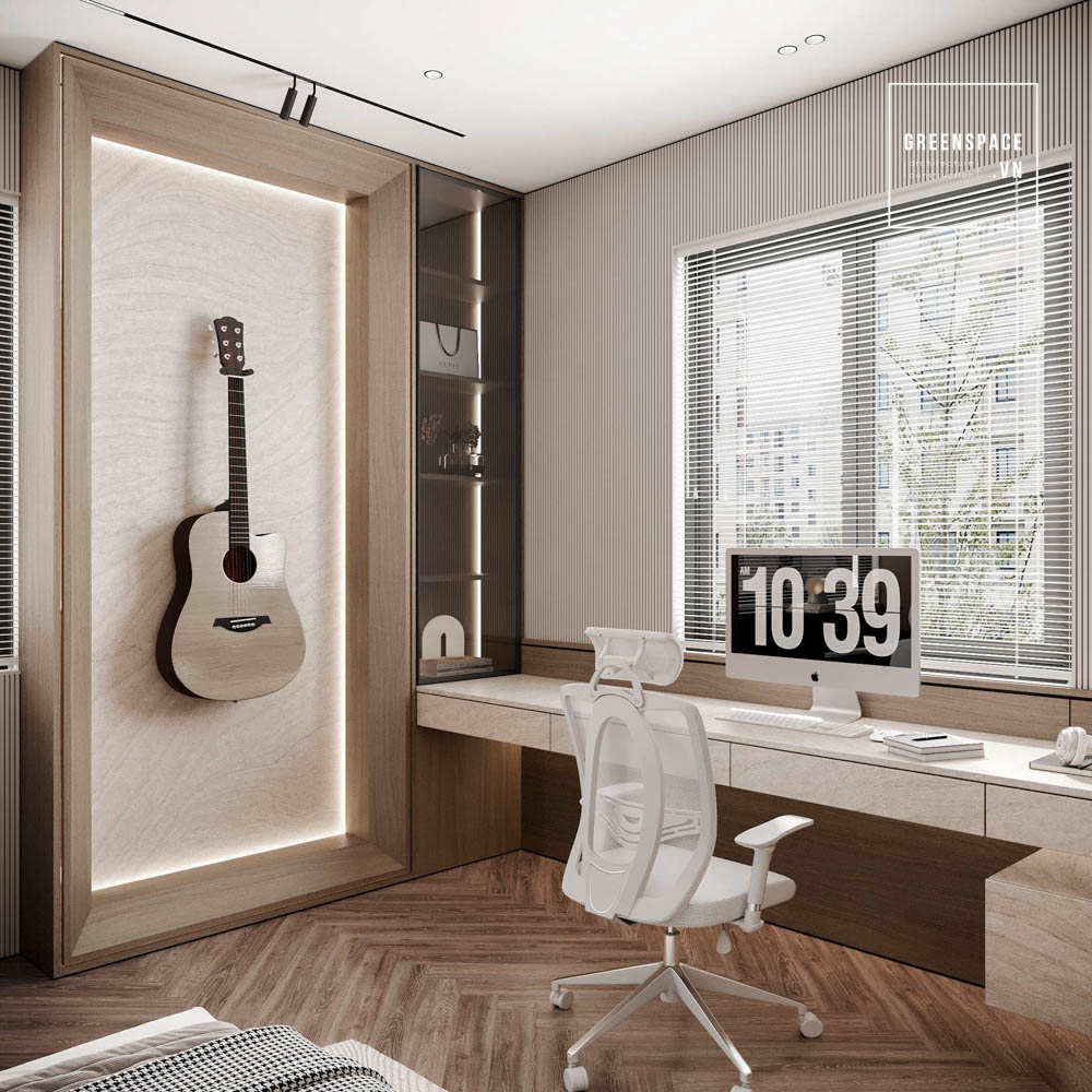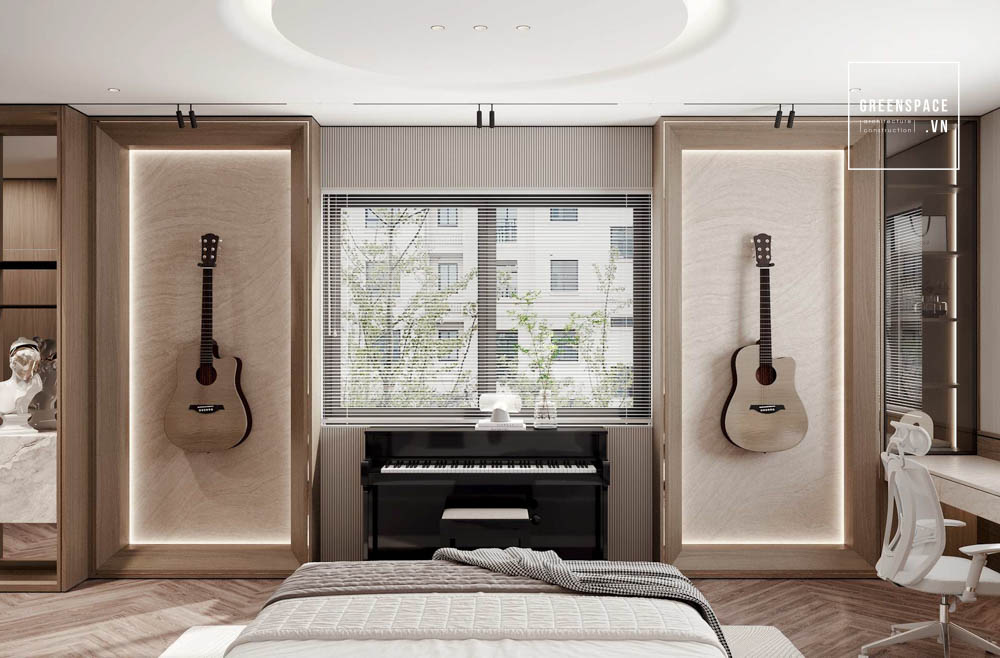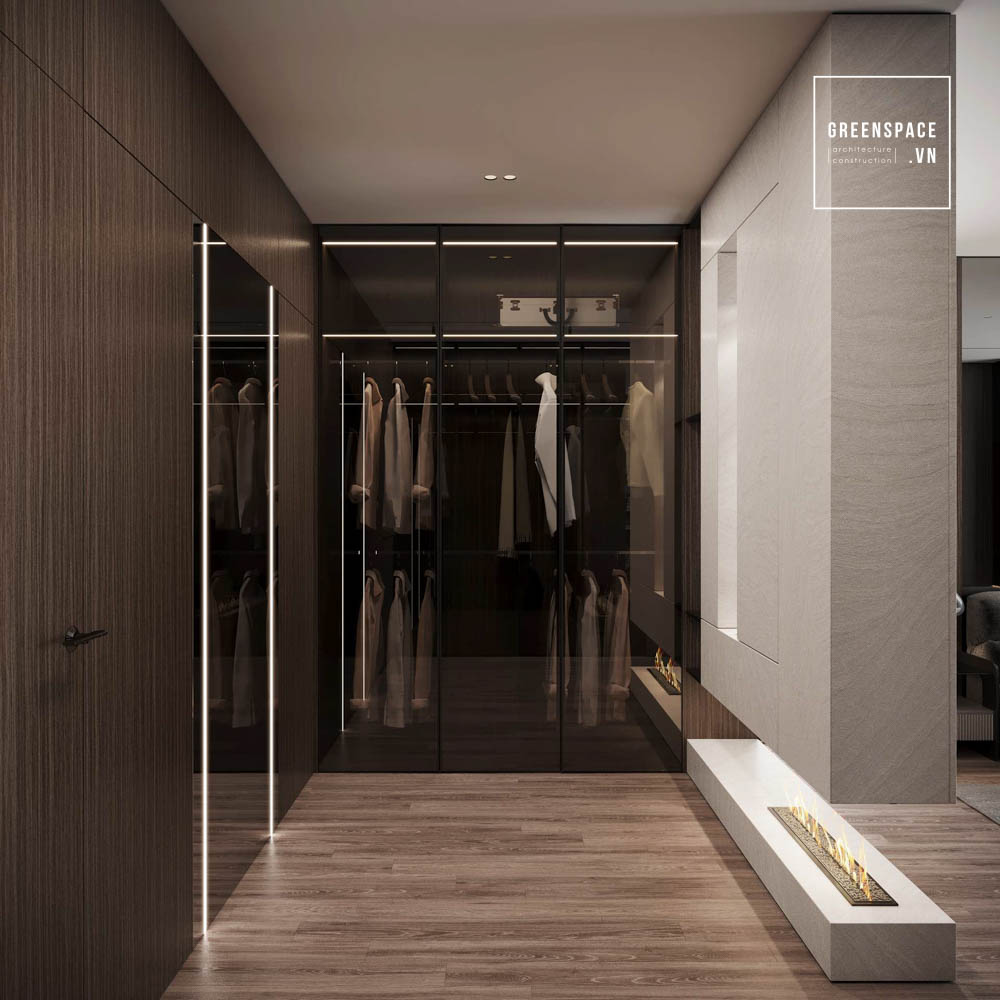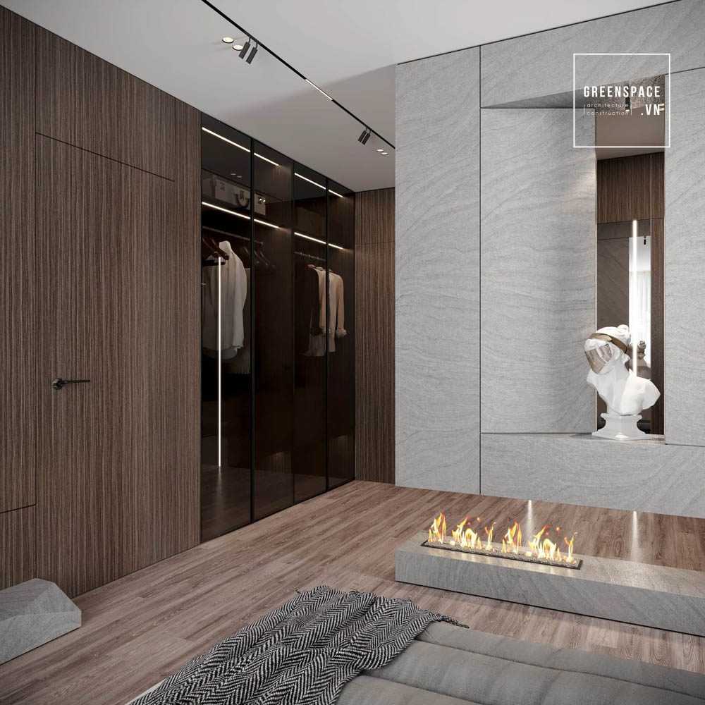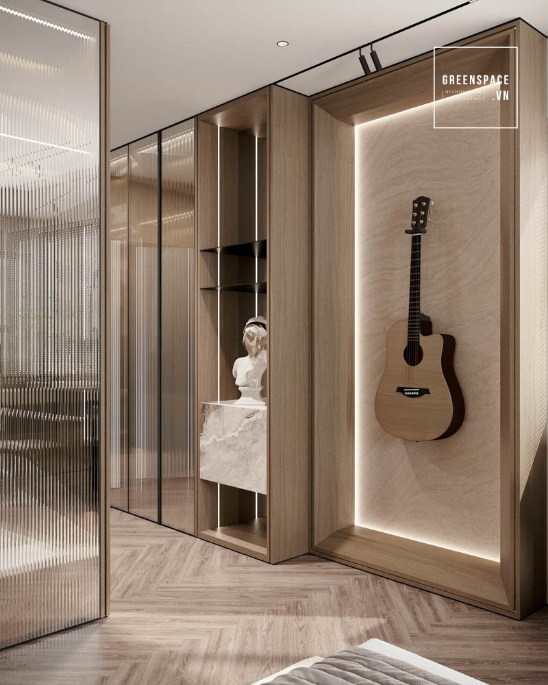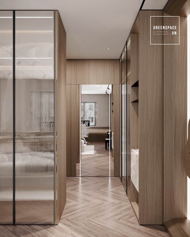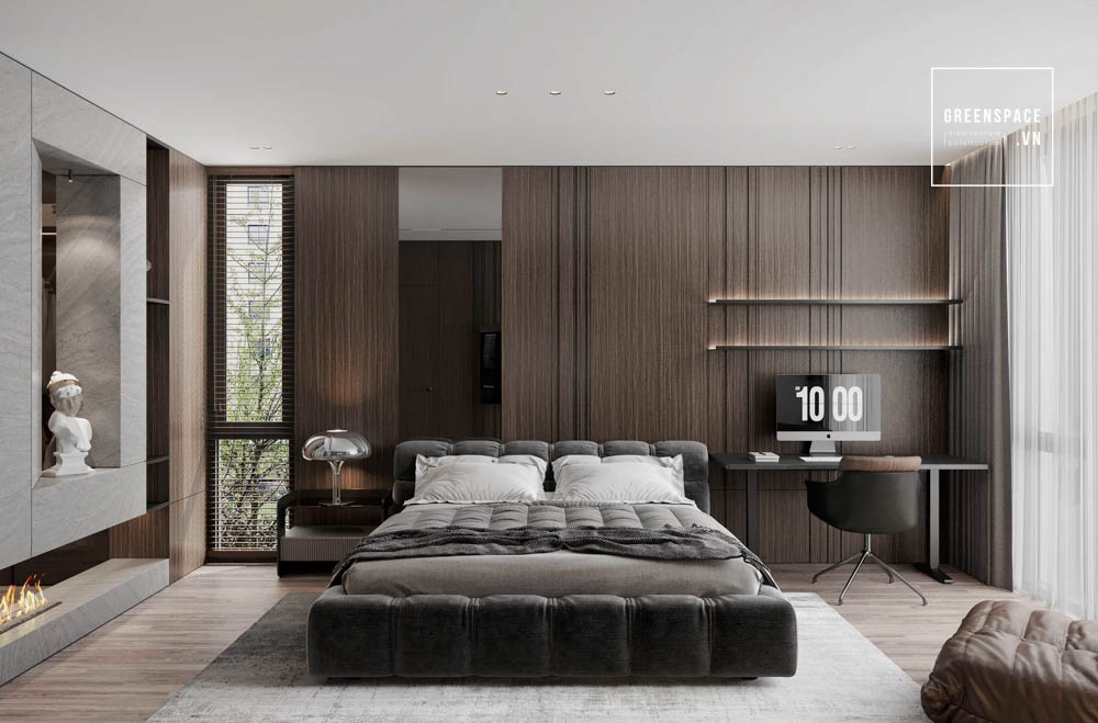 Không gian nội thất phòng ngủ mang phong cách hiện đại, gam màu trung tính tạo cảm giác sang trọng và thư giãn. Bố cục không gian mạch lạc, phân tách rõ khu nghỉ ngơi, làm việc và lưu trữ. Chất liệu gỗ kết hợp đá và kính giúp tổng thể hài hòa, ấm áp nhưng vẫn tinh tế. Hệ tủ âm tường và vách trang trí tối ưu diện tích sử dụng hiệu quả. Ánh sáng tự nhiên được khai thác tốt, kết hợp đèn chiếu sáng tạo chiều sâu không gian.
