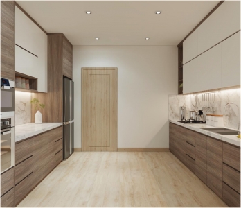 Vật liệu được sử dụng cho công trình bao gồm các loại gỗ công nghiệp thân thiện môi trường được xử lý bề mặt tốt kết hợp các loại đá trang trí như Solid Surface, tấm ốp 3d… tạo ra một không gian kiến trúc đậm nét hẹn đại.
