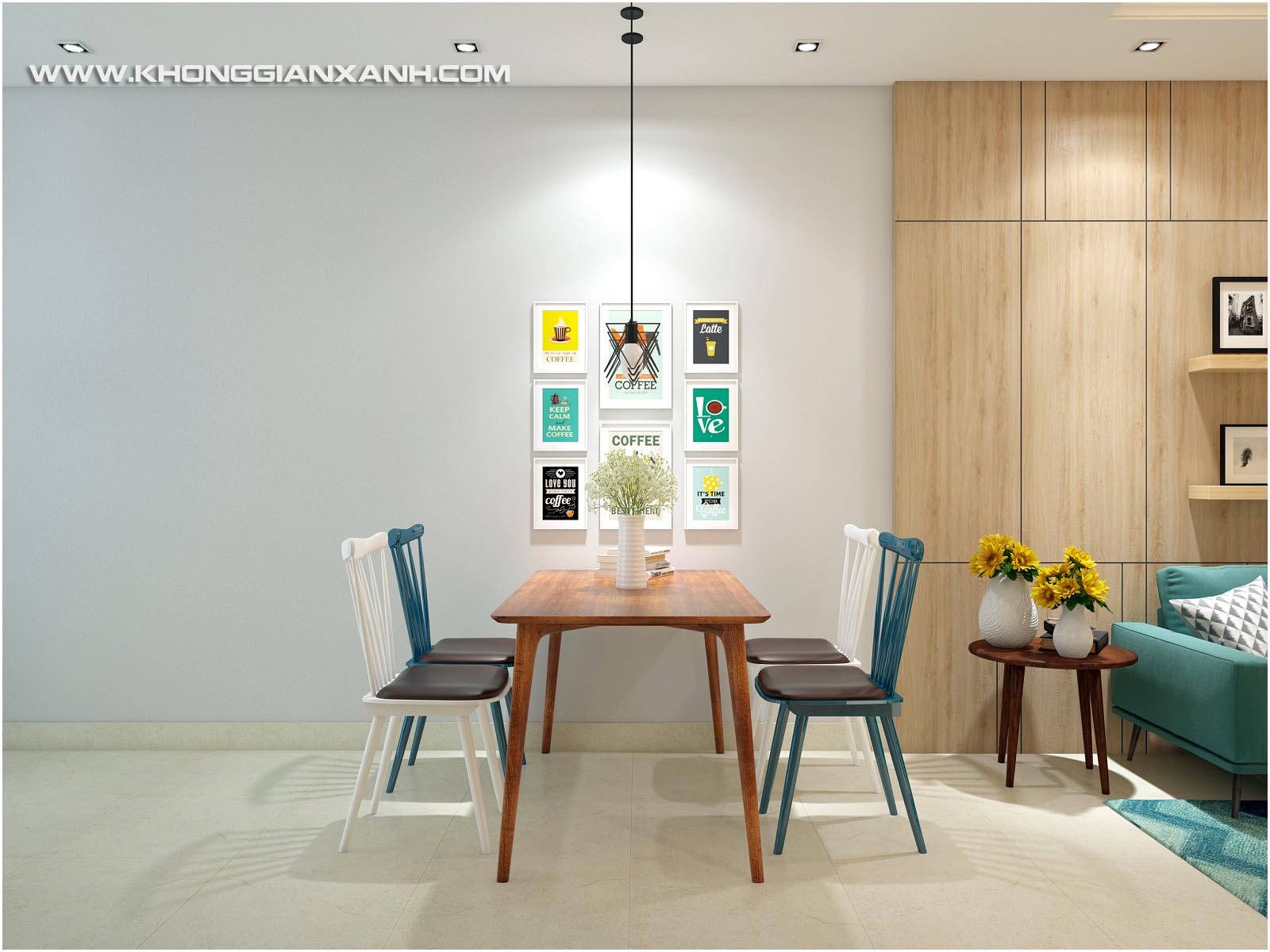 Sofa xanh, nổi bật nhưng hài hòa trên vách ốp gỗ sậm màu, bạn có nghỉ đây là 1 góc phòng khách chung cư? hay một góc trong studio ảnh?