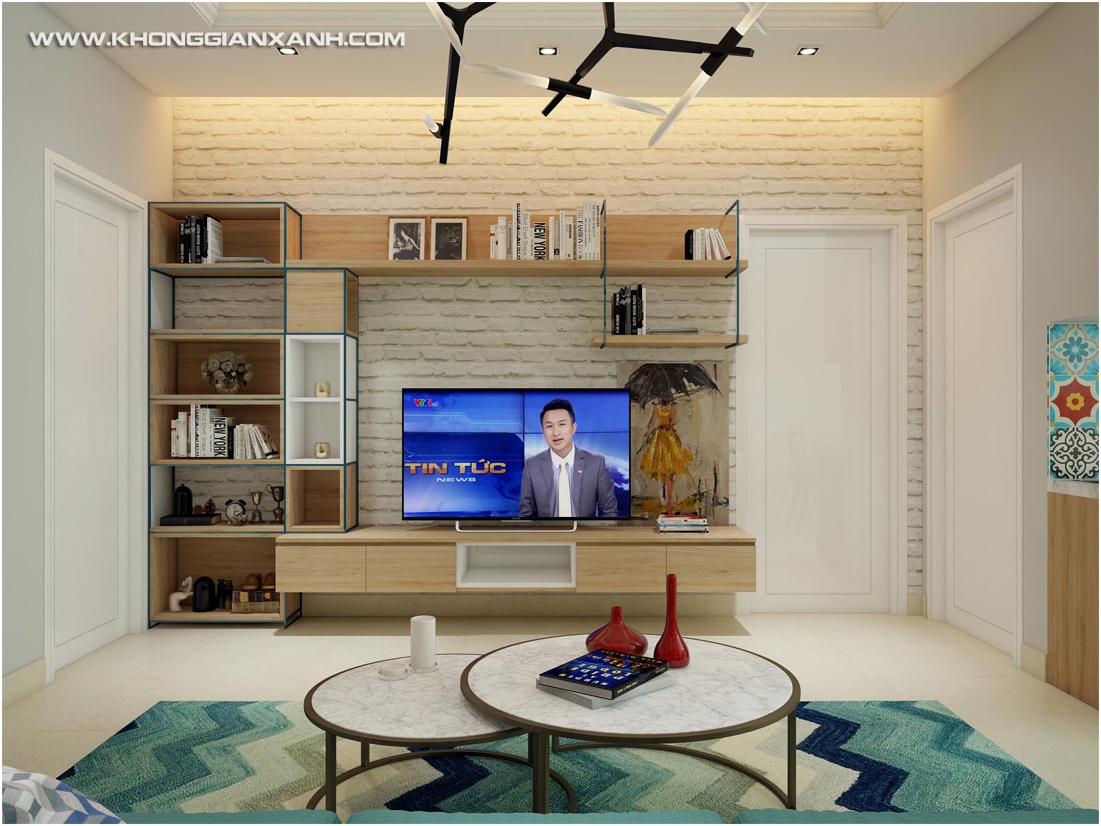 Mảng tường phòng khách với giấy dán tường giả gạch trần kết hợp đồ gỗ và liên kết sắt vừa tạo vẽ mới lạ vừa tạo sự ấm cúng gần gũi cho ngôi nhà