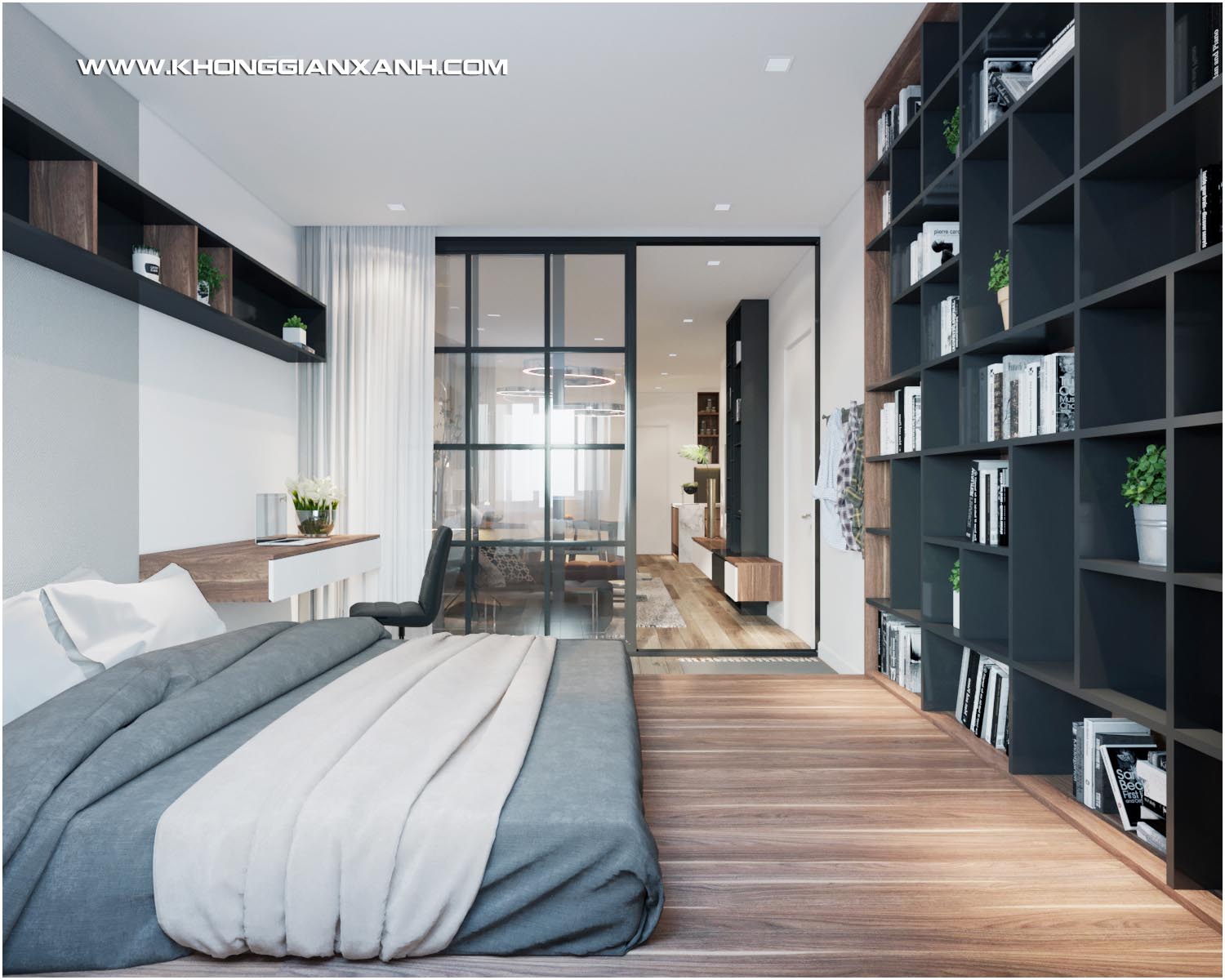 Nhược đểm của căn hộ khi không gian phòng khách bị ngăn cách với không gian cửa sổ hướng ra bên ngoài bởi 1 phòng ngủ được các kiến trúc sư của Kiến trúc Không Gian Xanh giải quyết bằng 1 vách kính lấy sáng xuyên phòng kế hợp hệ màn cửa. Thiết kế này giúp linh động trong việc sử dụng không gian cũng như làm tăn tính thẩm mỹ cho căn hộ mà trước đó vốn bị bó hẹp không gian bởi các vách tường.