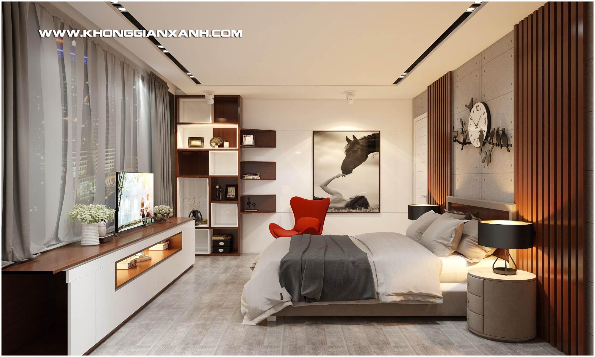 Phòng ngủ ấm cúng sinh động với nội thất trầm và view thoáng sẵn sàng cho mỗi sáng mai