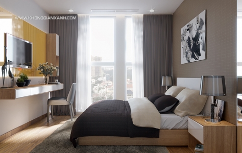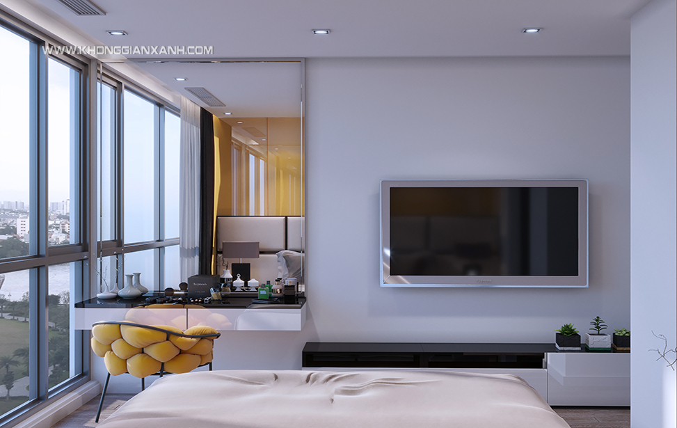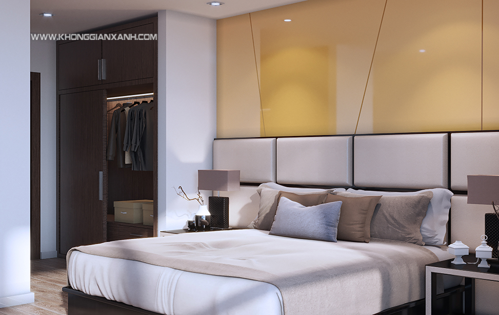 Thiết kế phòng ngủ Master sang trọng, tone màu nhẹ nhàng giúp gia chủ có thể thư giản, thoải mái,vách trang trí đầu giường được sử dụng vật liệu acrylic màu vàng giúp tôn lên vẻ sang trọng, lịch lãm của căn phòng và phù hợp gia chủ mệnh kim.