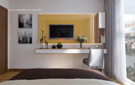 Kệ tivi của phòng ngủ khách cũng được chọn màu vàng làm điểm nhấn