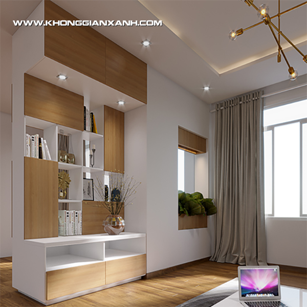 Dùng vách ngăn kết hợp kệ trang trí để phân chia căn phòng,thể hiện được sự tận dụng không gian tinh tế của gia chủ. Một góc nhỏ của căn phòng đươc thiết kế để lấy ánh sáng tự nhiên kết hợp những mảng cây xanh nhân tạo giúp căn phòng thông thoáng và đầy đủ ánh sáng giúp tạo cảm giác gần gũi với thiên nhiên.