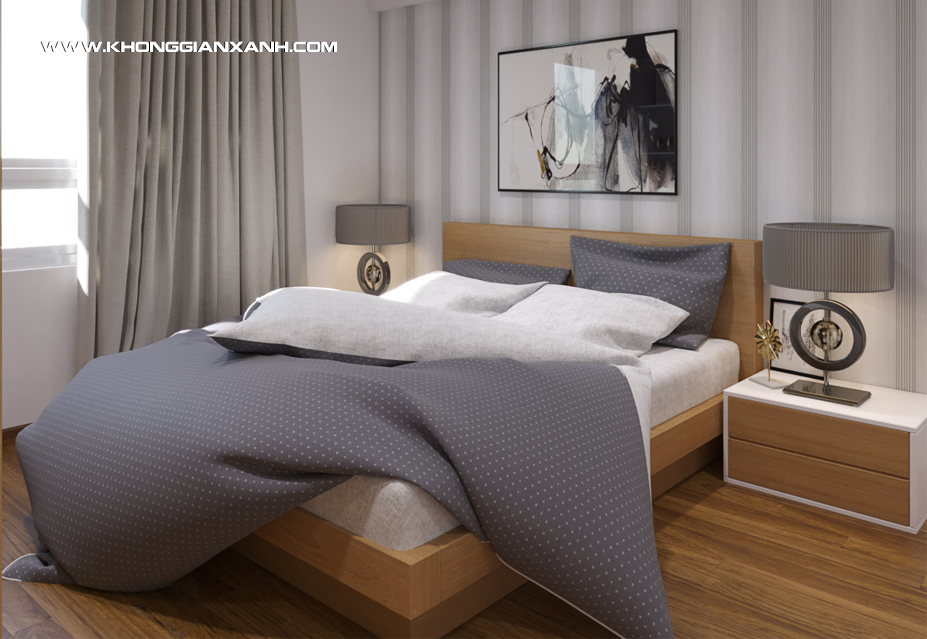 Phòng ngủ master với tone màu trung tính , nhẹ nhàng, cửa sổ được sử dụng vách kính cường lực để đón nhận ánh sáng, giúp căn phòng thoải mái, dễ chịu.Tuy phòng ngủ không quá rộng rãi nhưng với cách sử dụng nội thất bằng gỗ sáng màu đem lại sự sáng sủa, rộng rãi và mộc mạc cho không gian căn phòng.