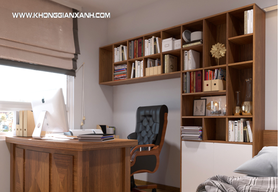 Gia chủ dành hẳn một không gian riêng để làm việc, nội thất của căn phòng đơn giản chỉ gồm những vật dụng cần thiết là bàn, ghế, kệ sách, tủ chứa hồ sơ và những giấy tờ cần thiết và giường để gia chủ có thể nghỉ ngơi, tất cả đều được làm bằng gỗ công nghiệp. Bàn làm việc được đặt gần cửa sổ để lấy ánh sáng tự nhiên, tạo cảm giác thoải mái, có thể nhìn ngắm khung cảnh bên ngoài giúp giảm sự căng thẳng và đem lại hiệu quả công việc cao.
