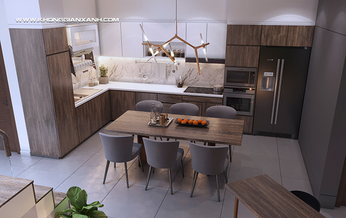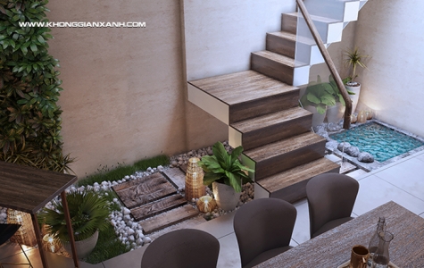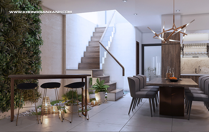 Bếp nhà phố được thiết kế mở với hướng nhìn ra tiểu cảnh tạo một không gian cho nữ chủ nhân của căn nhà có một không gian bếp lãng mạng. Không gian này được coi là quan trọng nhất, là nơi giữ lửa cho gia đình, người phụ nữ trổ tài nấu nướng đem đến những món ngon cho gia đình thân yêu.Với những đường nét tinh tế kết hợp nội thất hài hòa đã tạo ra một không gian nhẹ nhàng,dễ chịu, hiện đại và sang trọng.