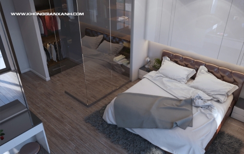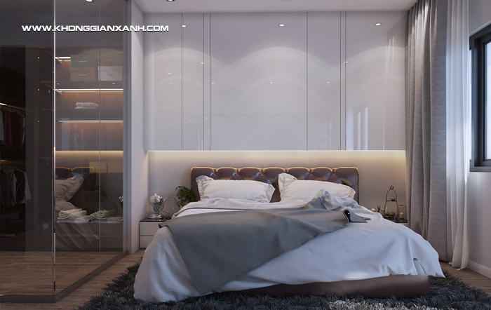 Căn phòng đã tận dụng được tối đa nguồn ánh sáng tự nhiên thông qua cửa sổ được mở rộng. Closet room dường như có sự ngăn cách rõ ràng nhờ vách ngăn bằng kính giúp mở rộng không gian, tránh cảm giác bị gò bó.