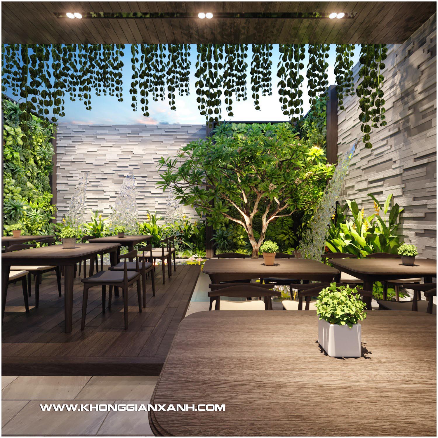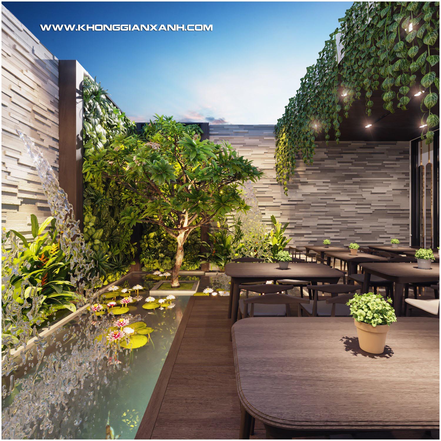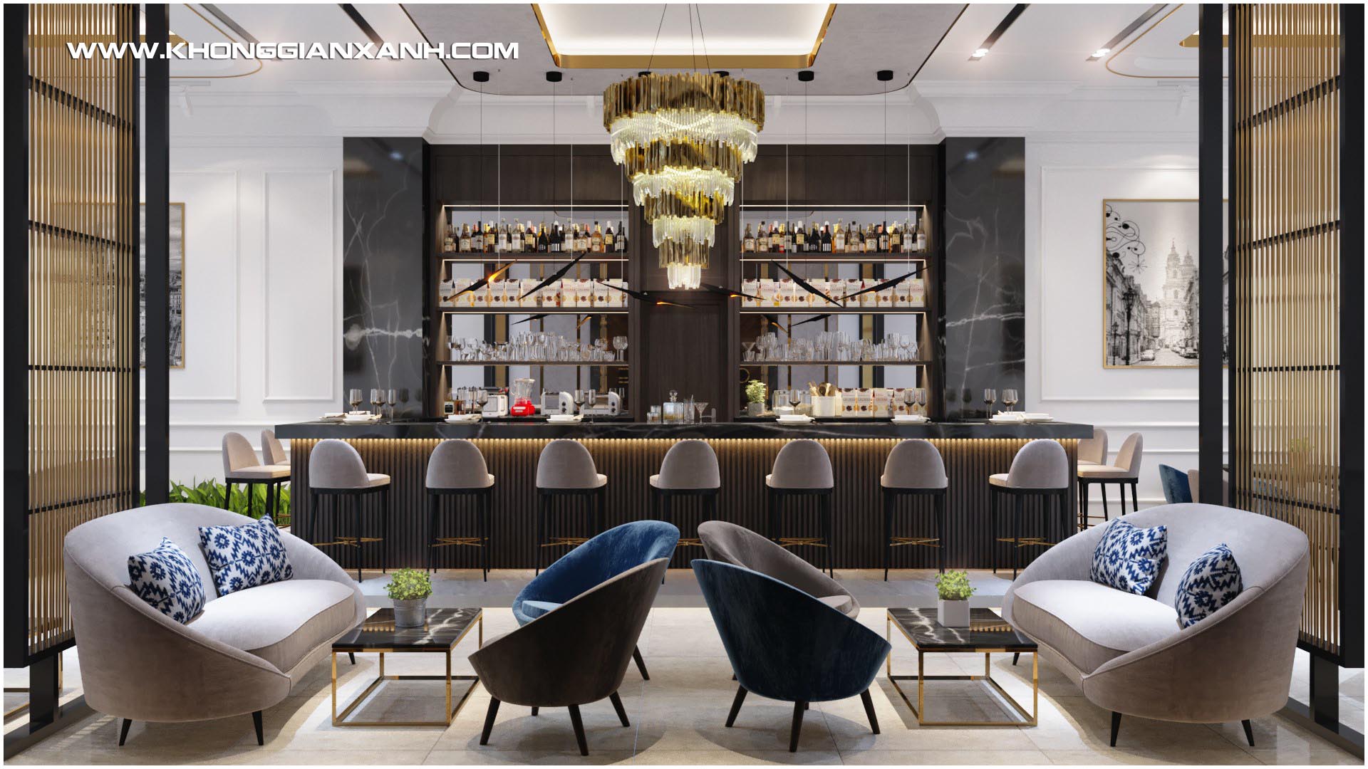 Khu vực quầy bar và phòng lạnh được thiết kế pha phối giữa nét hiện đại và cổ điển để không làm nặng nề kiến trúc của quán và để kết nối tốt hơn với khu vườn cảnh cuối tòa nhà thiết kế mảng khối hiện đại.