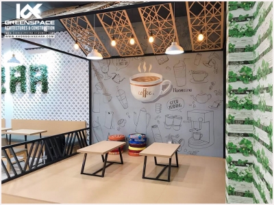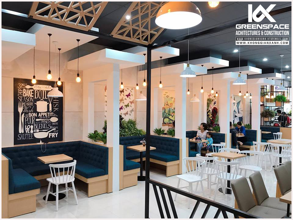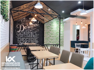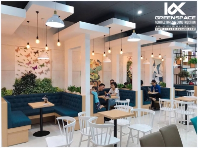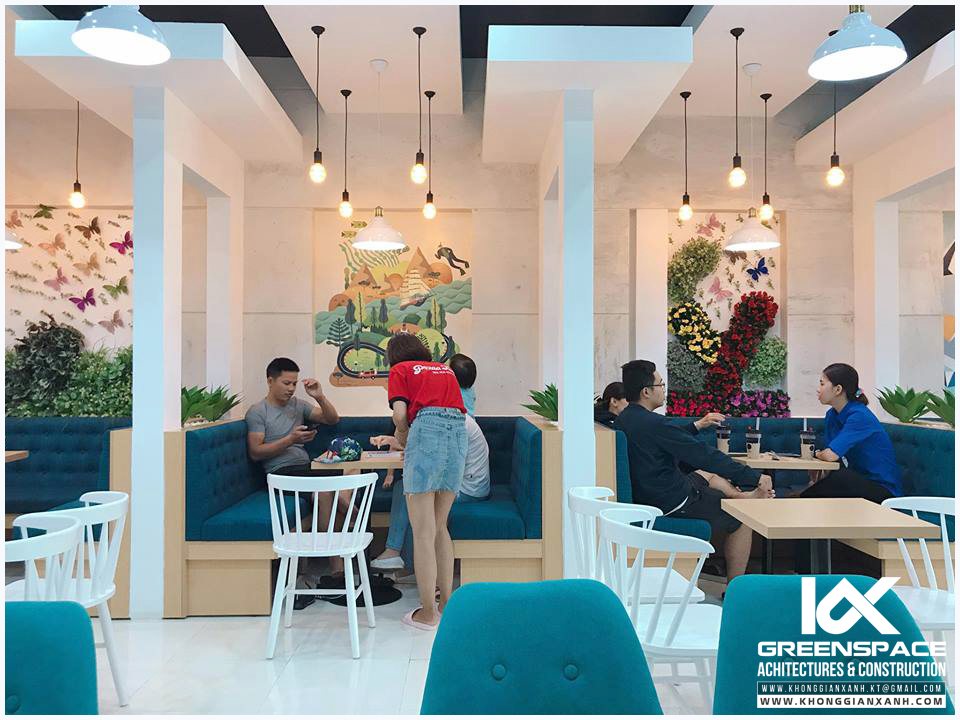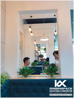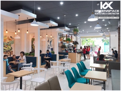 Không gian quán hút mắt giới trẻ bởi một không gian và màu sắc rất teen, nơi đây tràn ngập không gian xanh và cảm giác tươi mát. Bên trong quán được thiết kế như kiểu ngoài trời, đảm bảo tính mở, nhưng vẫn có không gian riêng tư cho khách. Không có nhiều ánh sáng tự nhiên nên tập trung hệ thống ánh sáng trắng từ đèn trang trí, vừa giúp tôn lên vẻ đẹp của đồ nội thất, vừa mang đến cảm giác thư thái, dịu êm cho thực khách.