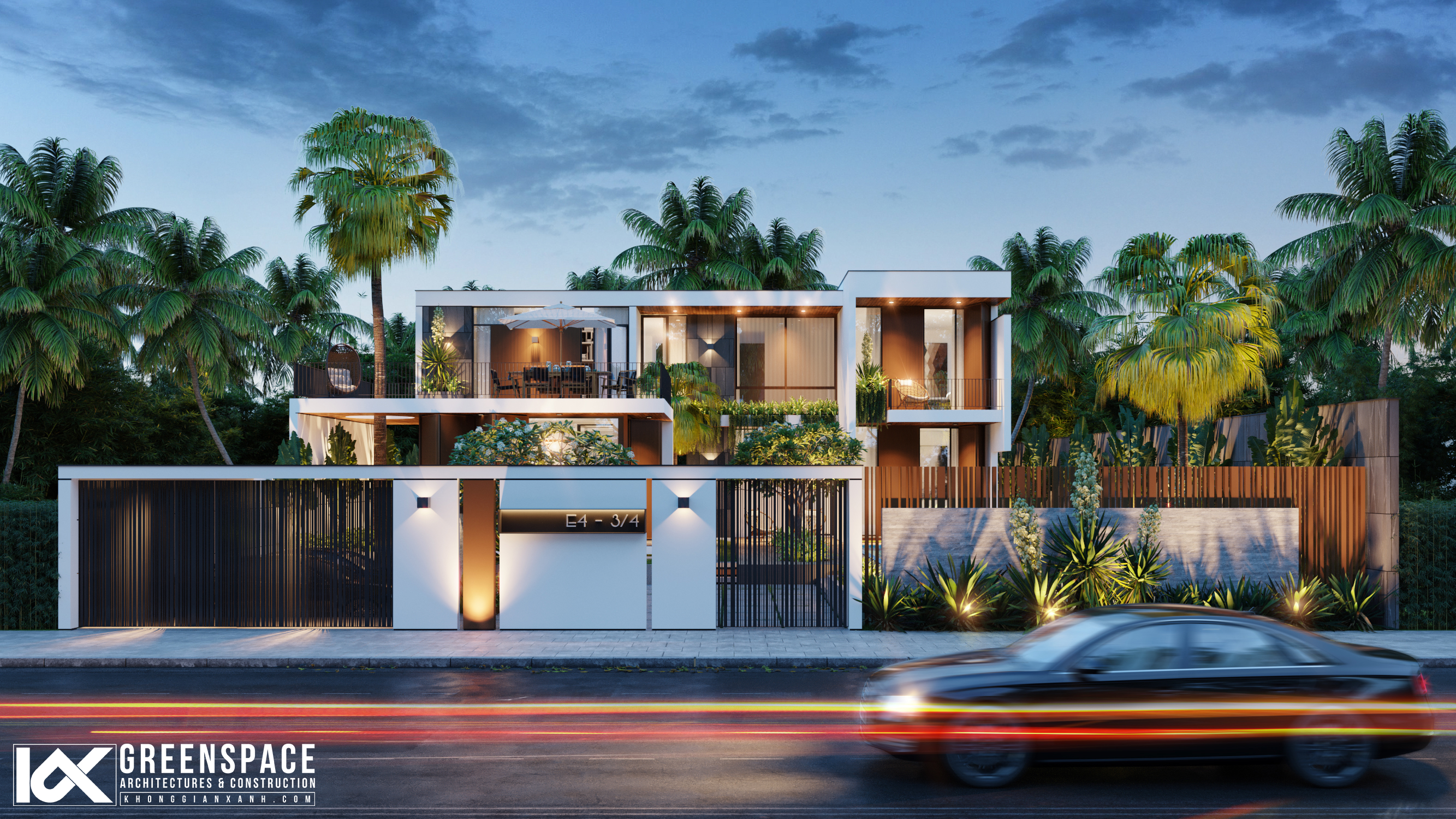Khối hình phân tán với điểm nhấn là khu hồ bơi diện tích lớn kết hợp hệ thống sân vườn được phân cấp hài hòa tạo nên một tổng thể sinh động và giàu sức sống. Các không gian chức năng trong nhà như: khu nhà xe, phòng khách, phòng ăn và hiên trà đạo được bố trí với view mở rộng tối đa tạo sự giao kết không gian rộng và mở.