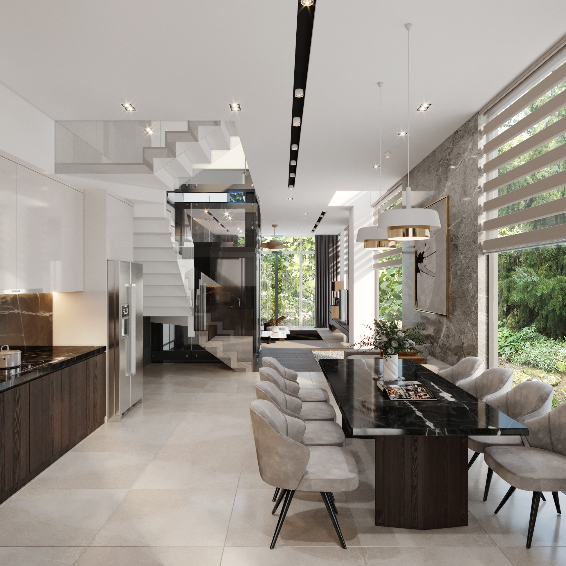 Thiết kế sử dụng các chất liệu điểm nhấn như đá marble cho khu bếp, gạch ốp trang trí cho phòng khách, kết hợp với hệ thống đèn hắt trang trí màu vàng ấm… tất cả đều tạo nên sự nhấn nhá hài hòa, thanh lịch cho ngôi nhà.