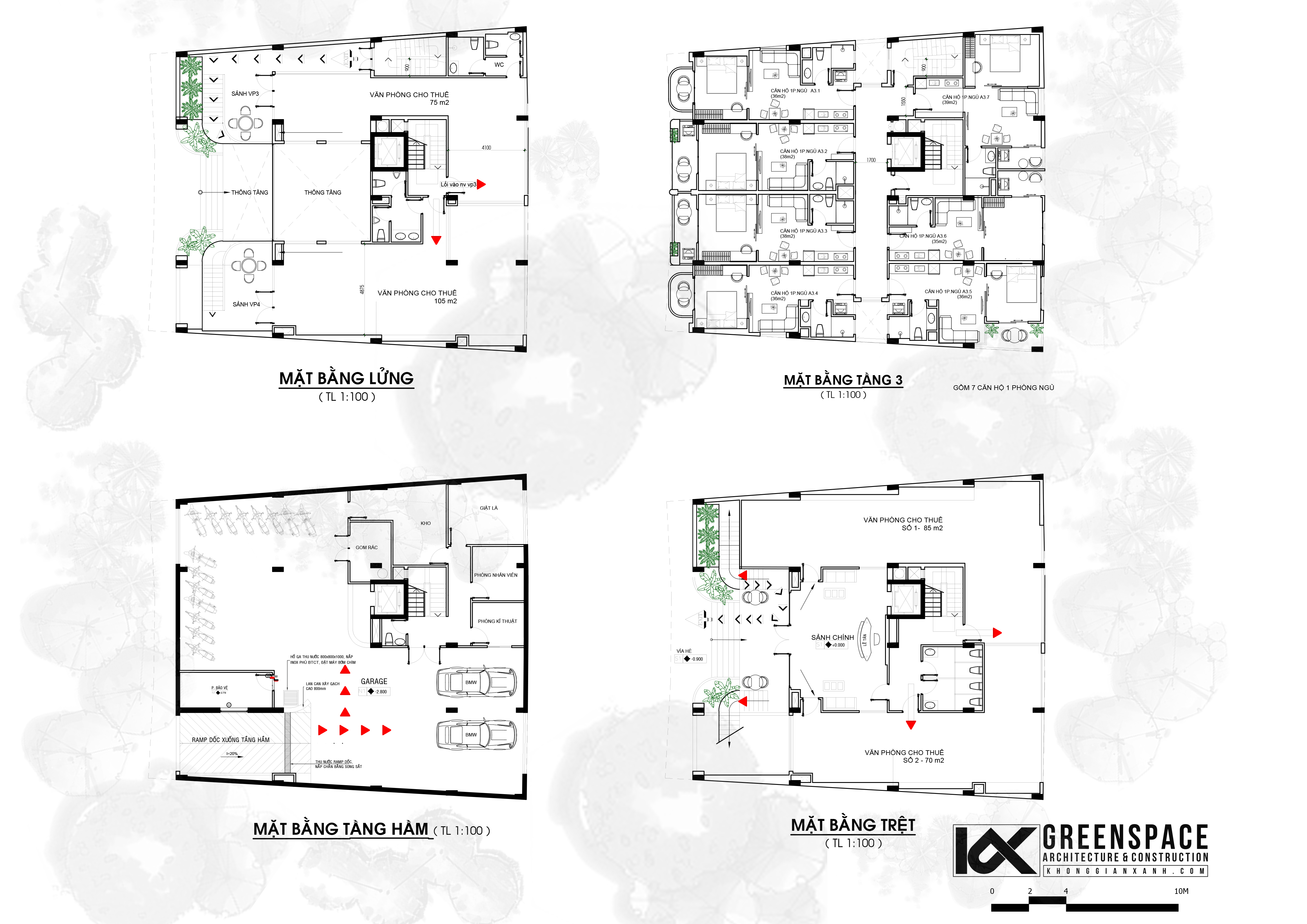 Tầng 1 sảnh chính của căn nhà được thiết kế rộng rãi với các lối lên tách biệt cho khu văn phòng và khu căn hộ cho thuê. Yếu tố cây xanh được điểm xuyết xuyên suốt công trình, từ những khóm cây ở sảnh đón cho tới khu ban công các tầng.