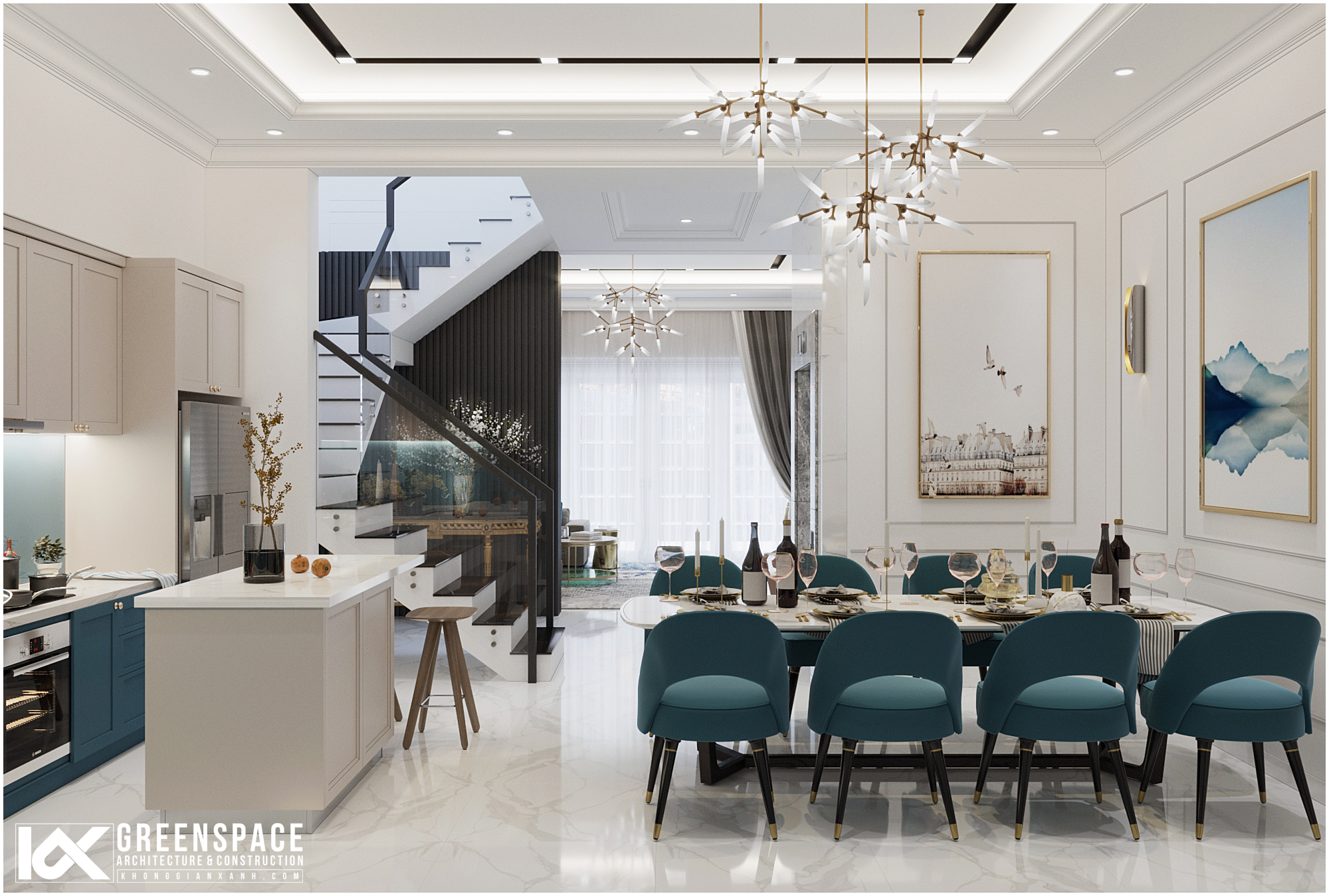 Phòng ăn nổi bật với bộ bàn ăn màu xanh sẫm ngăn cách với khu bếp bằng một đảo bếp nhỏ. Đường nét màu sắc hiện đại, kết hợp với những chi tiết phào chỉ tân cổ điển công với các chi tiết đèn chùm trang trí tạo nên một thiết kế nội thất nhà phố tân cổ điển sang trọng, hiện đại và đẳng cấp.